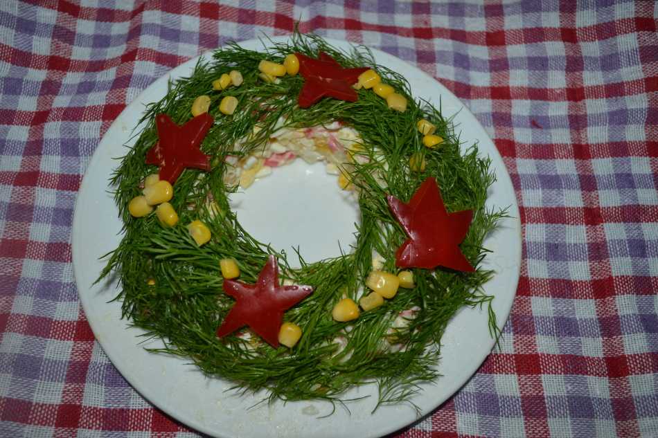 Укроп, в силу своих мелких веточек, становится прекрасным украшением для салата. Особенно, если его мелко нарубить. Его удобно можно распределять по всей площади слоя, он создаст равномерный и не просвечивающийся фон. Часто его используют для того, чтобы «нарисовать» на своем салате веточки ели. Это актуально при приготовлении праздничных новогодних и рождественских салатов.