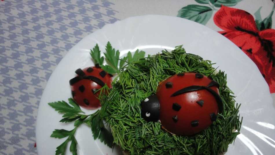Все слои промазать майонезом. Сверху посыпать измельчённым зелёным луком и зеленью. Украсить можно по желанию. Я разрезала помидорки пополам, смазала низ майонезом и выложила на салат как туловища божьих коровок. Из маслин сделала головы, лапки, точечки. Из зелёного салата — ободок вокруг. Получилась вот такая полянка.