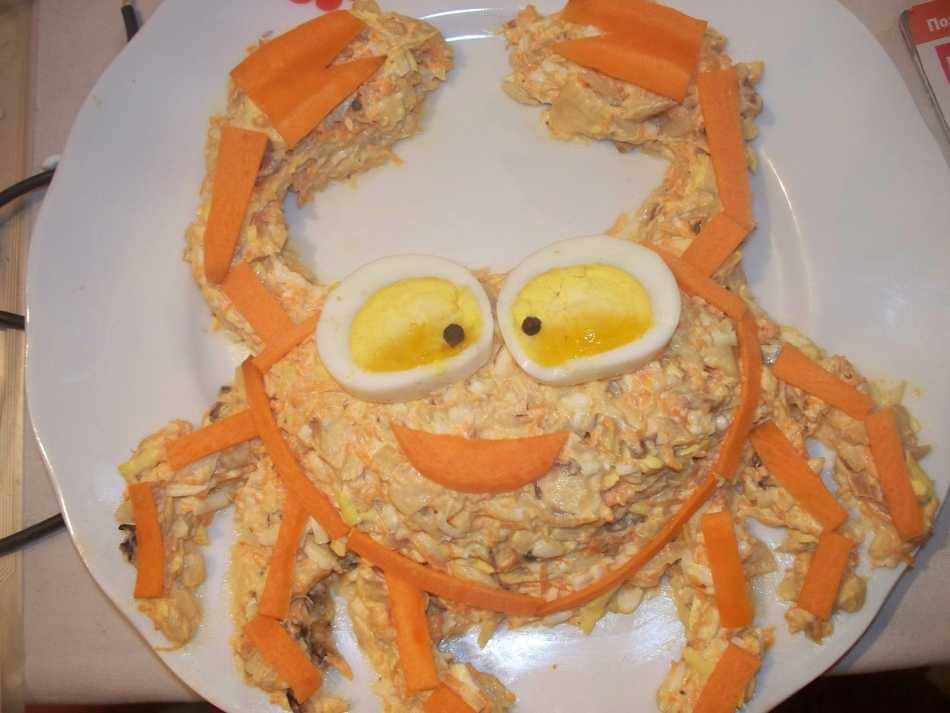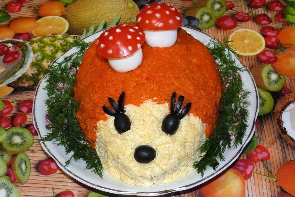 И, конечно, в форме гриба легко выложить любую салатную массу. Вот как можно красиво оформить грибные салаты (фото с описанием показаны ниже). Например, с помощью тертой моркови, яйца и сыра.