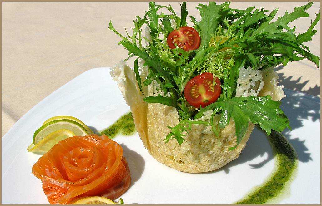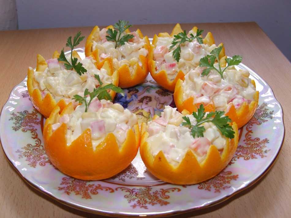 Даже классические салаты можно подать настолько оригинально, что их никто не узнает. Например, салат «Оливье» можно подать в форме цилиндра при помощи кулинарного кольца, после чего обернуть его тонкими полосками огурца, украсить перепелиными яйцами и зеленью. Любой другой салат можно подать в чашечках из листьев пекинской капусты. И смотрится эффектно, и форму держит хорошо.