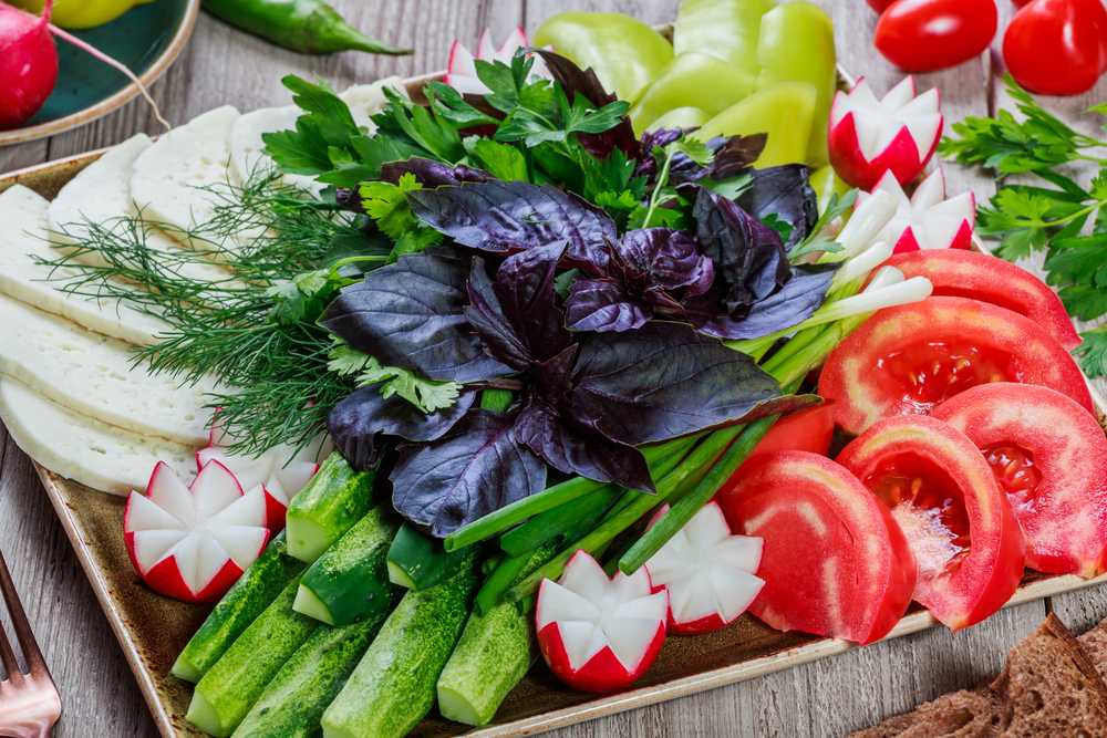 Красивая нарезка получается из овощей, разделенных на дольки или пластины одинакового размера и формата. Если вы не хотите оставлять слишком много отходов, откажитесь при выкладке от колечек из помидоров, редиса или огурцов. При такой обработке верхнюю и нижнюю часть овощей однозначно придется выбрасывать.