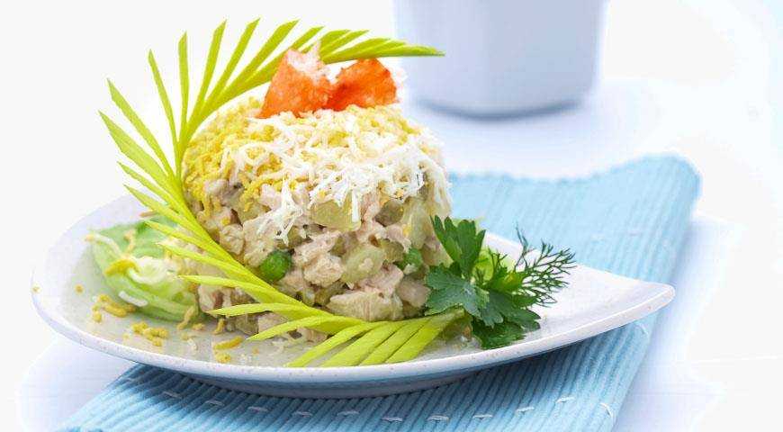 Украсить в виде рояля, используя для этого твердый сыр и оливки черного цвета. Также Вы можете из слабосоленой семги сформировать красивую розочку, которая великолепно преобразит весь пейзаж салата.