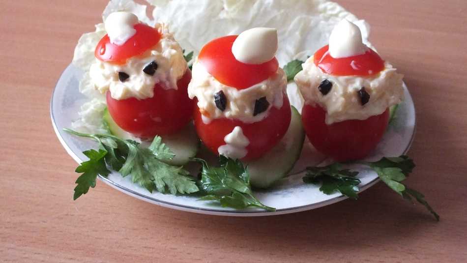 Стандартный и традиционный способ украшения салата помидорами — фарширование их салатом. Маслины и майонез помогут создать определенный рисунок.