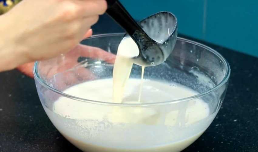 - Подогретое до 35 градусов молоко влить тонкой струйкой в сухую смесь, регулярно помешивая. Должна получиться масса, типа жидкой сметаны.