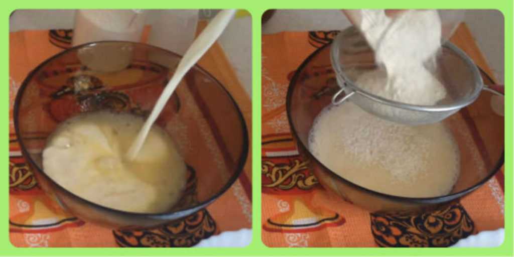 4. В получившуюся смесь просеять муку. Делать это нужно обязательно, и даже желательно два раза. Во время этой процедуры мука насыщается кислородом. А это нужно для того, чтобы изделия получились легкими и воздушными. К тому же в них будет появляться больше дырочек.