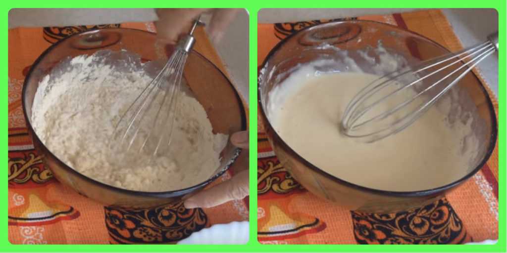 Муку вводим в половину объема жидкости, взбиваем, растираем образовавшиеся комочки и вводим остальную жидкость.