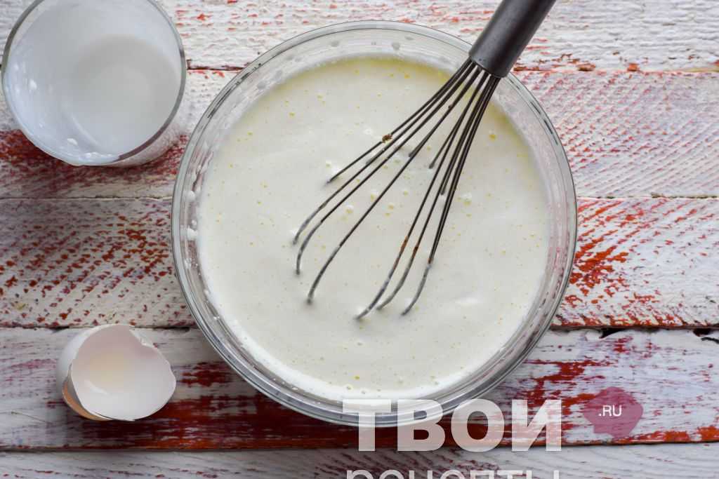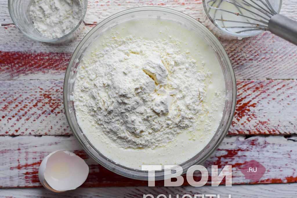 - Тонкой струйкой, не переставая помешивать, влейте кефир. Затем частями добавьте муку.