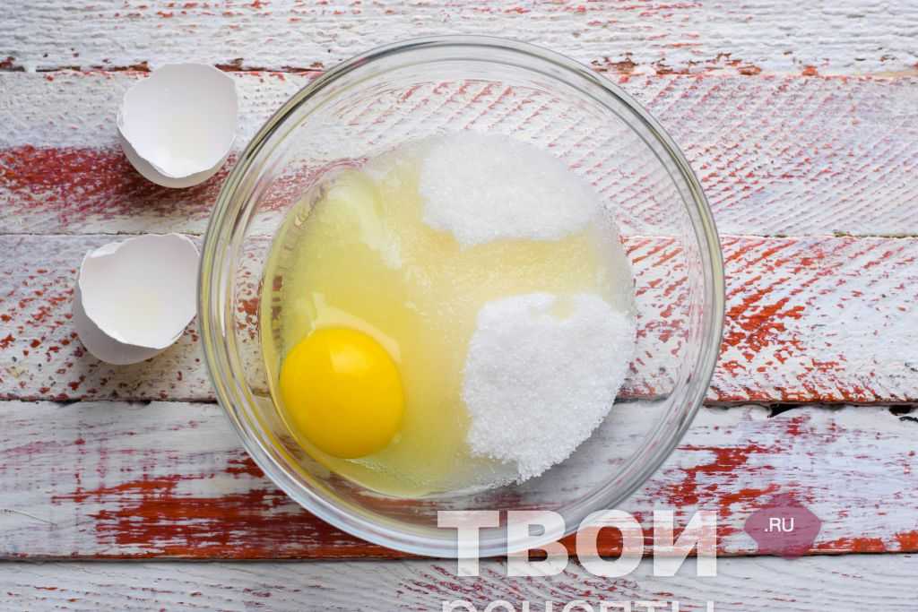 - Отдельно взбить с сахаром яйца, ввести в кефирную смесь, перемешать.