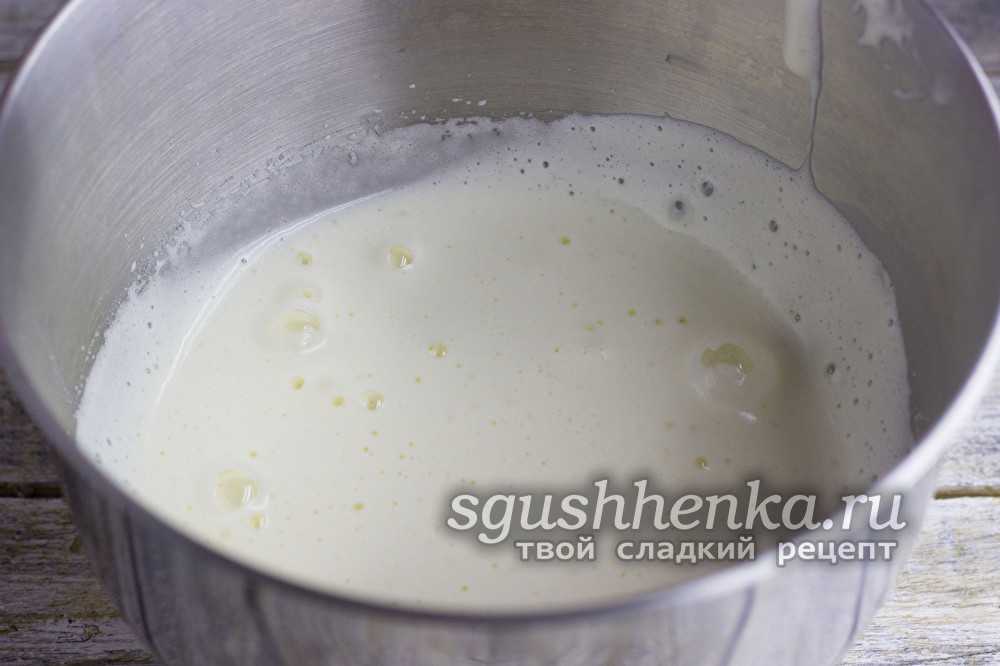 - Взбивая, влить масло растительное, затем молоко.