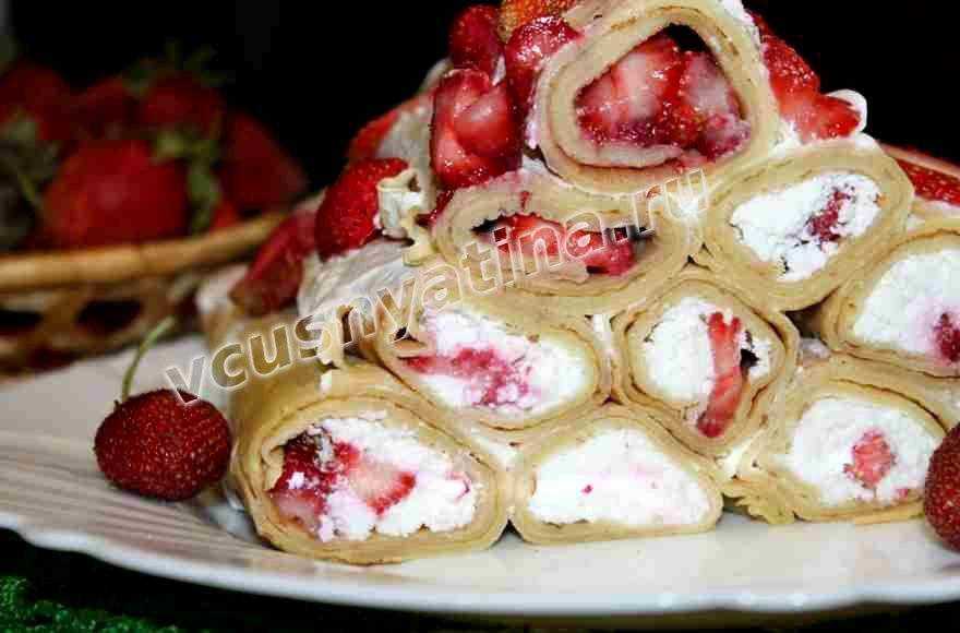 Теперь еще проще – на краешек блинчика выложите немного творога, а сверху разложите клубнику.