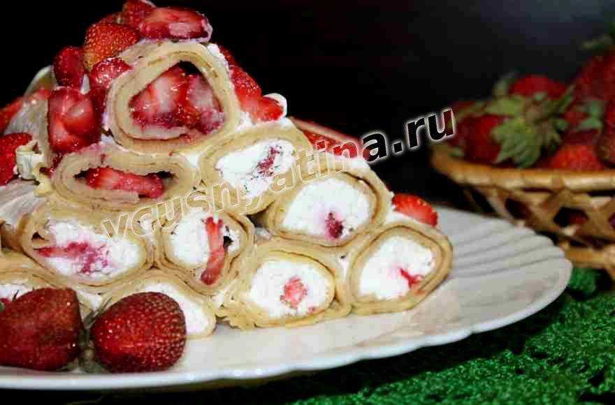 Вот и все, вкусные и ароматные блинчики с творогом и клубникой, рецепт которых я вам показала, готовы. Накрывайте на стол и приглашайте семью снимать пробу. Нет, не все! Если к вам намыливаются гости, соберите шикарнейший торт, уверяю, все просто ахнут!