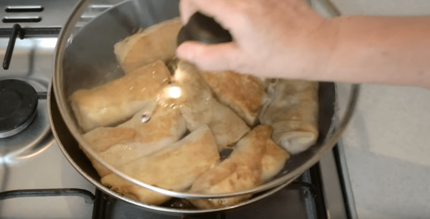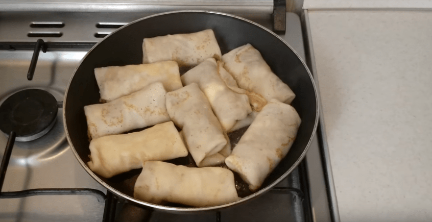 А для того, чтобы готовый блин не пережарился во время готовки есть один простой ход- блины, в которые будет заворачиваться начинка нужно пропечь только с одной стороны. То есть выливаем тесто на сковороду, ждем пока низ подрумянится и сразу убираем блин со сковороды.