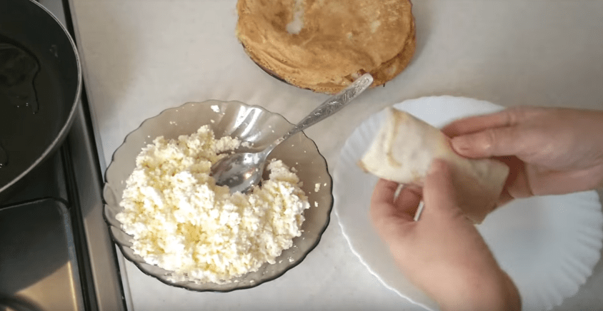 1. Блинчики с начинкой мы будем обжаривать на сковороде. Тому есть две причины. Во-первых, яйцо, которое будет вмешано в творог должно пропечься. Во-вторых, поджаренный блинчик не разворачивается.