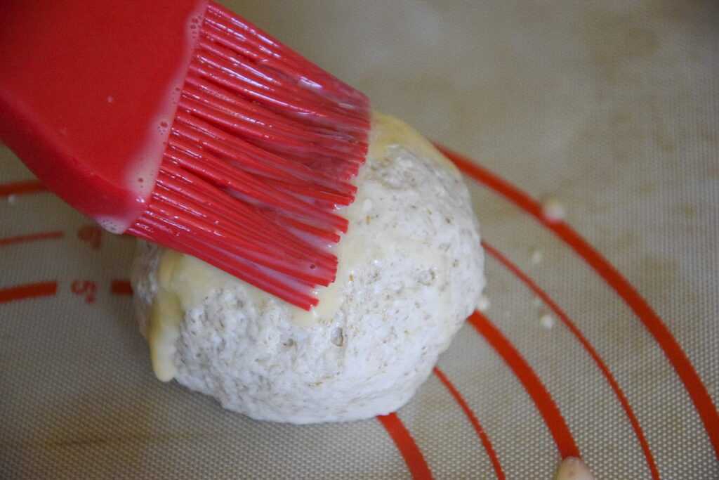 Теперь формируем из теста шарики и выкладываем на противень, застеленный силиконовым ковриком или пергаментом. Далее делаем смесь из яйца и молока, и сверху смазываем наши булочки с помощью силиконовой кисточки. Ну и конечно же щедро посыпаем кунжутом.