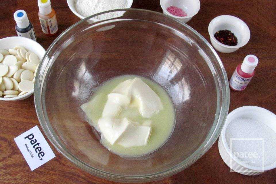 - Затем также в микроволновой печи топим белый шоколад, при желании делим его на несколько частей и окрашиваем с помощью масляных красителей в разные цвета.