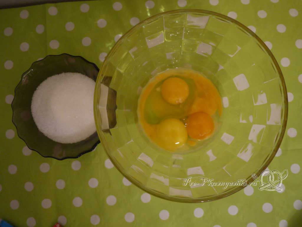 В глубокую миску отделяем яйца (4 шт) от скорлупы. Начинаем взбивать содержимое посуды миксером или венчиком и постепенно добавляем в нее сахар (3/4 ст).