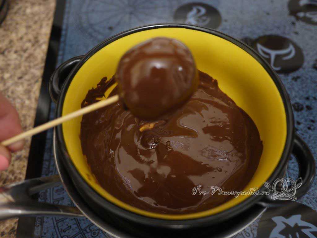 - Когда шарики остынут, достать их из формы, надеть на палочки и окунуть в растопленный шоколад.