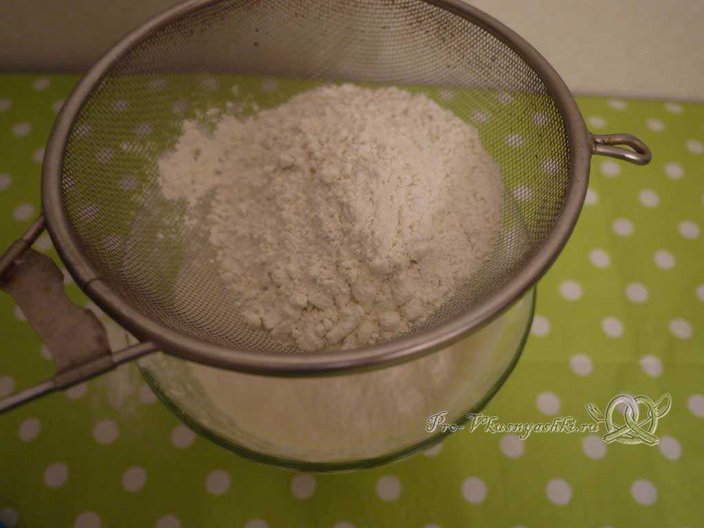 Затем через сито в несколько приемов всыпаем к яично-сахарной смеси пшеничную муку (1 ст + 1 ст.л).