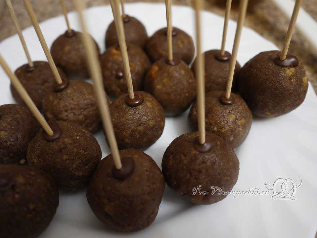11.Готовые шарики поставьте в холодильник на полчаса. Тем временем растопите двадцать грамм шоколада. Подготовьте длинные шпажки. Обмакивайте палочки в жидком шоколаде и втыкайте прямо в центр круглого комочка из бисквита. После этой процедуры вновь поставьте шарики в холодильник на пятнадцать минут.