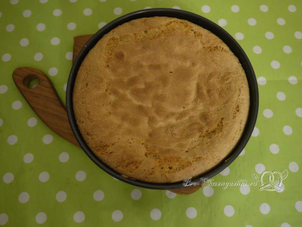 7.Разогрейте духовку до 180 градусов и поставьте в нее форму. Выпекайте бисквит тридцать-тридцать пять минут. Минут за пять-семь до конца выпечки температуру можно слегка снизить. Вытащите готовый корж из духовки, а затем из формы и дождитесь, пока он остынет.