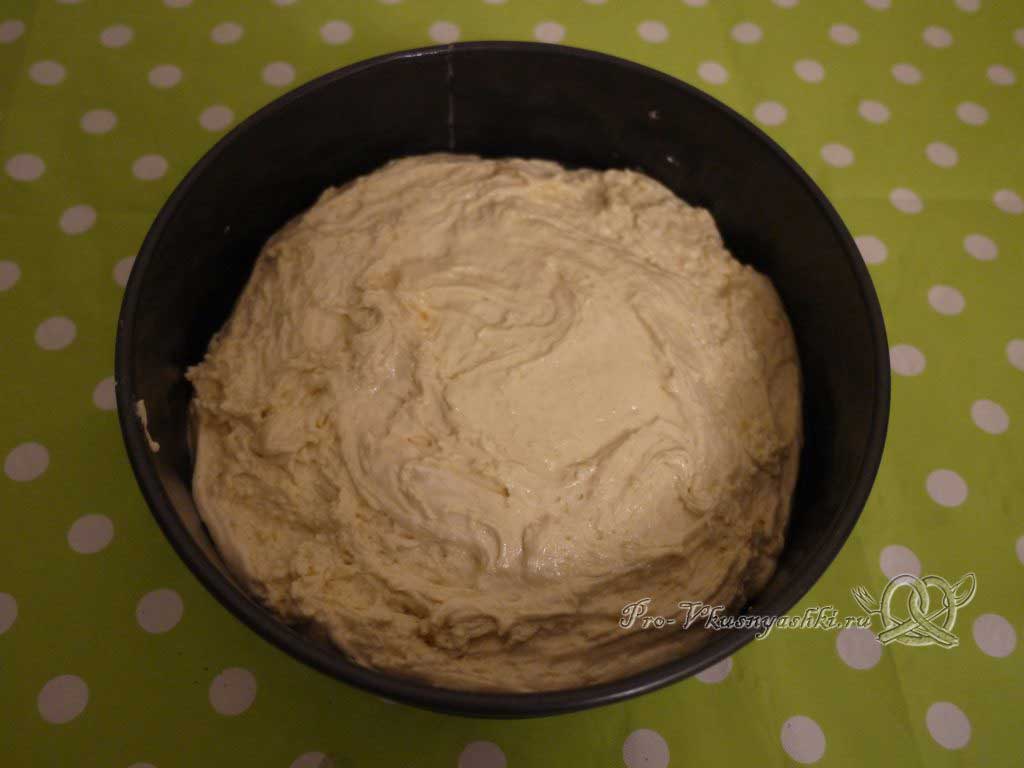 6.Возьмите форму для выпечки, застелите ее пергаментом или смажьте маслом сливочным (по желанию). Аккуратно вылейте в нее готовое жидкое тесто, разровняйте.