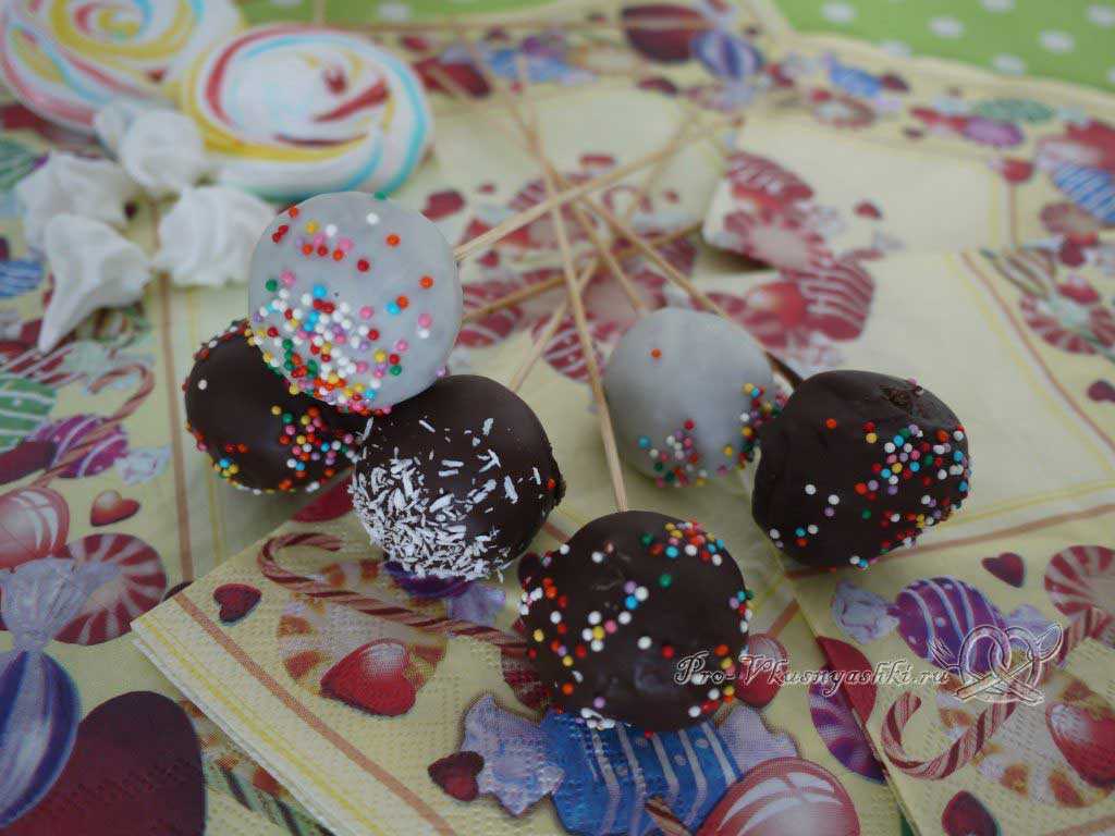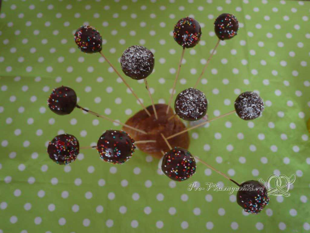 14.Поставьте шпажки вертикально и отправьте их в холодильник на полчаса. За это время глазурь застынет, и кейк попсы можно будет подавать к столу. Приятного аппетита!