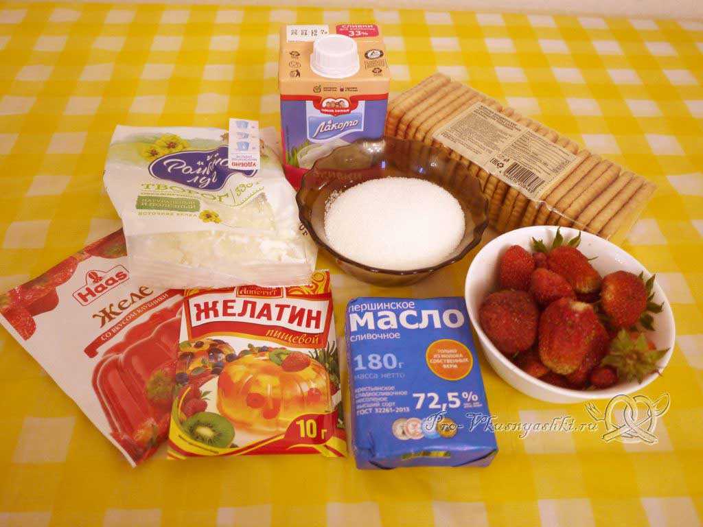 Клубничный чизкейк без выпечки с творогом готовится из следующих продуктов:
