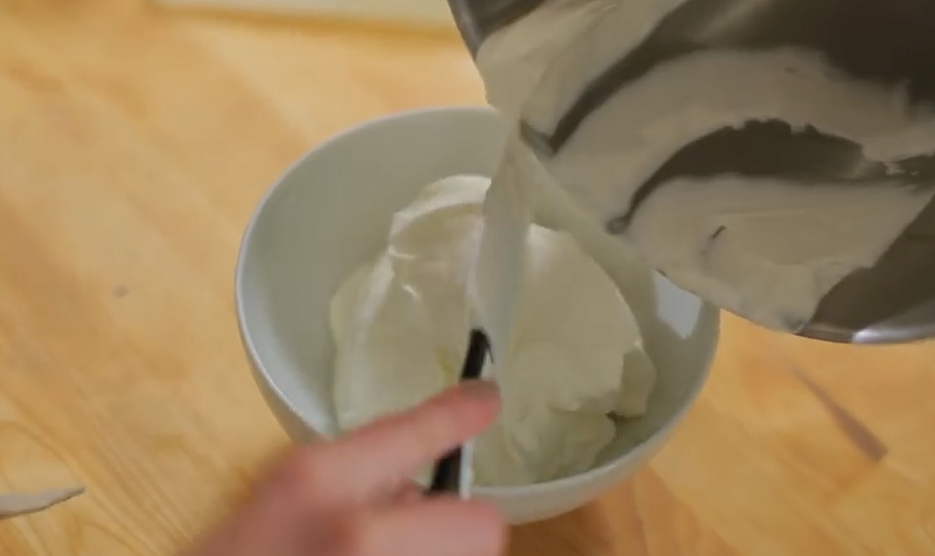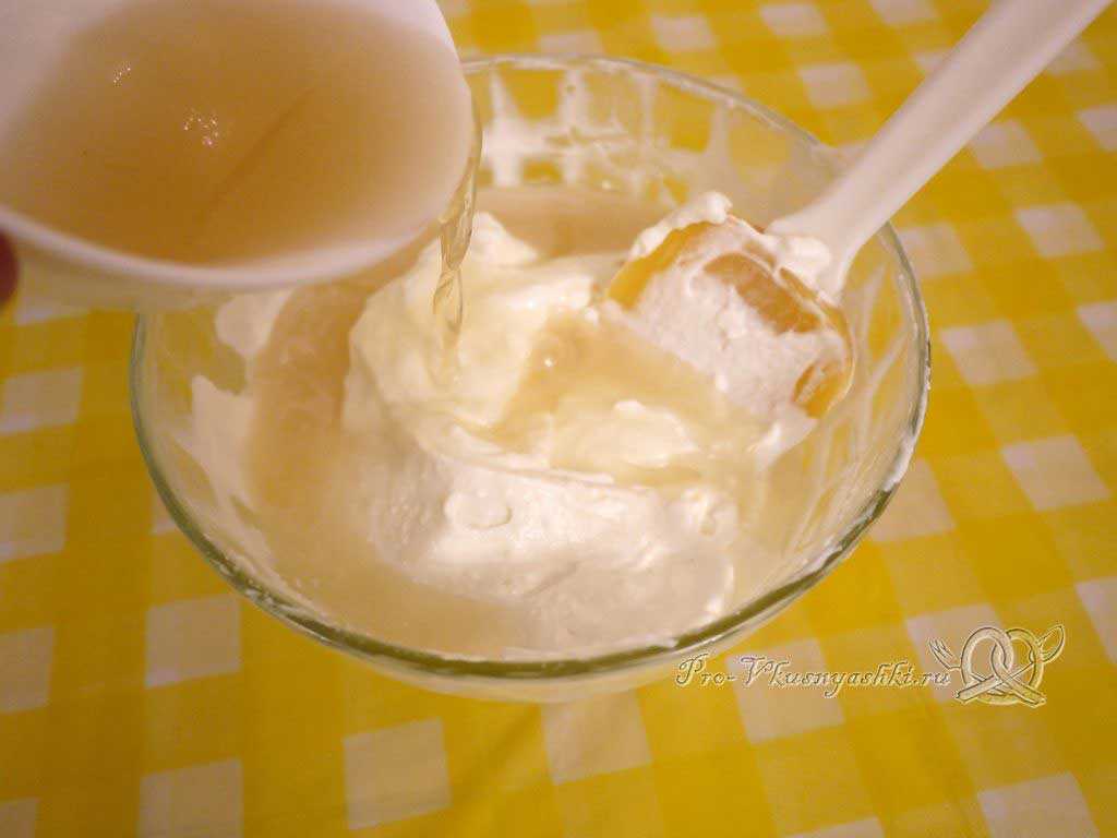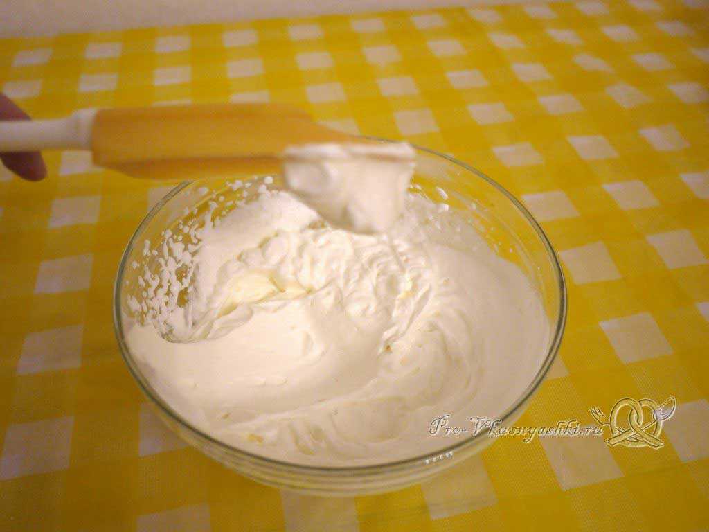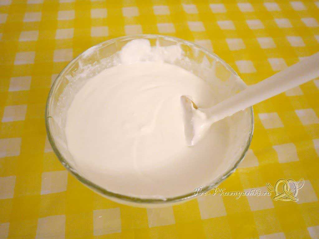 6. Отдельно взбиваем сыр Маскарпоне с сахарной пудрой и спустя некоторое время сюда же добавляем сметану или йогурт. Взбиваем еще несколько минут.