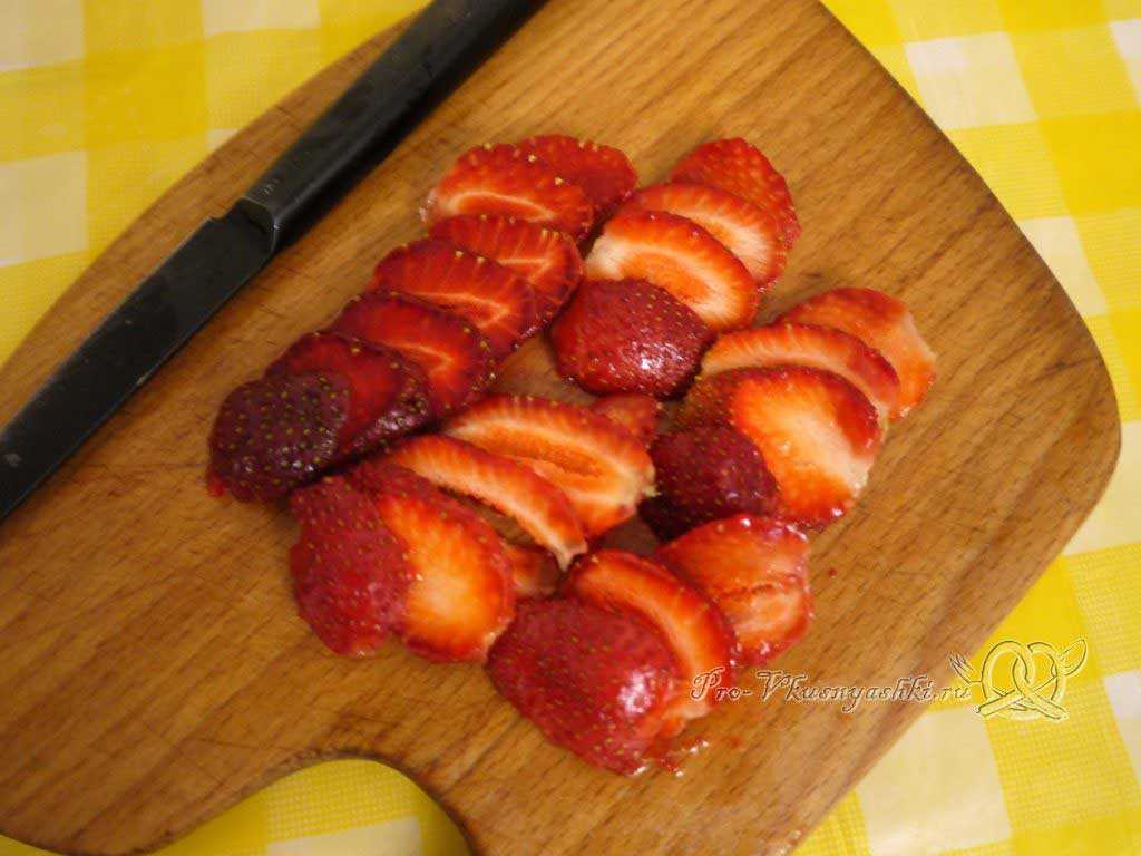 1. Ягоды помыть и обсушить, убрать у них зеленую юбочку. Затем порезать на доске на две, или три пластины. Вот так.