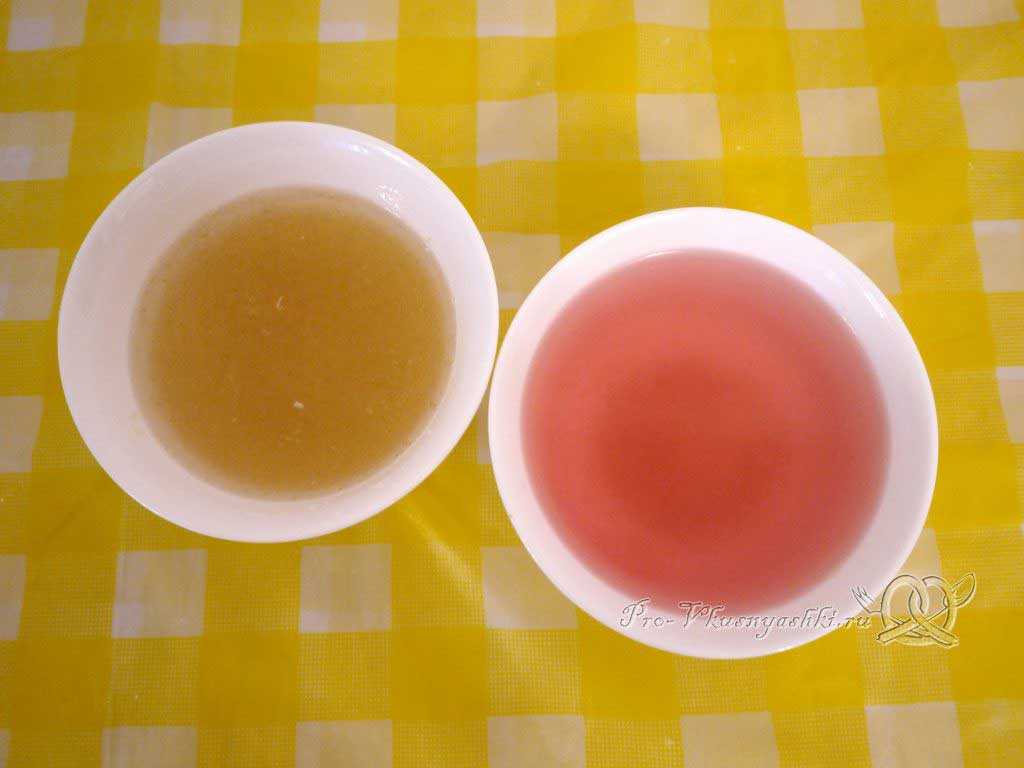 1. Первым делом приготовить желе. Здесь все просто. Следуем инструкции на упаковке. Всыпать порошок из двух пакетов в большую миску и залить его при помешивании горячей водой с температурой 90%. Вначале влить несколько ложек и перемешать. Затем можно вливать тонкой струйкой при непрерывном взбалтывании.