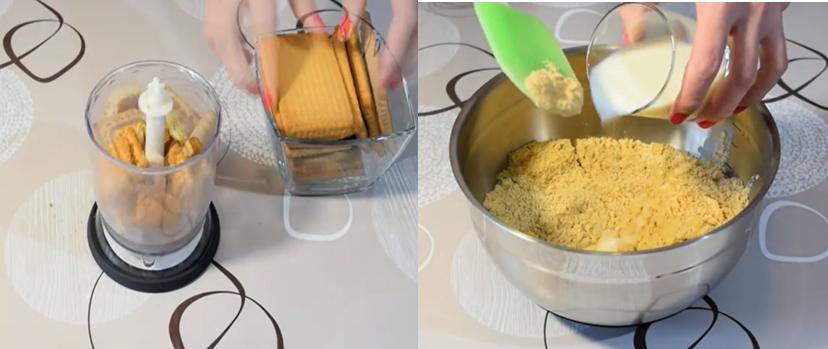 - Измельчаем печенье с помощью блендера. Вливаем в печенье молоко, размешиваем до однородной массы.