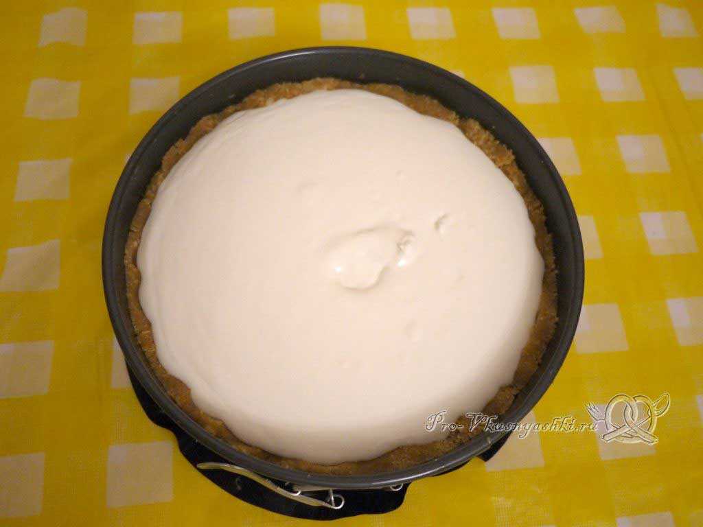 11. Достаем из холодильника форму с коржом и выкладываем на него красивый воздушный крем. Лопаточкой разравниваем поверхность.