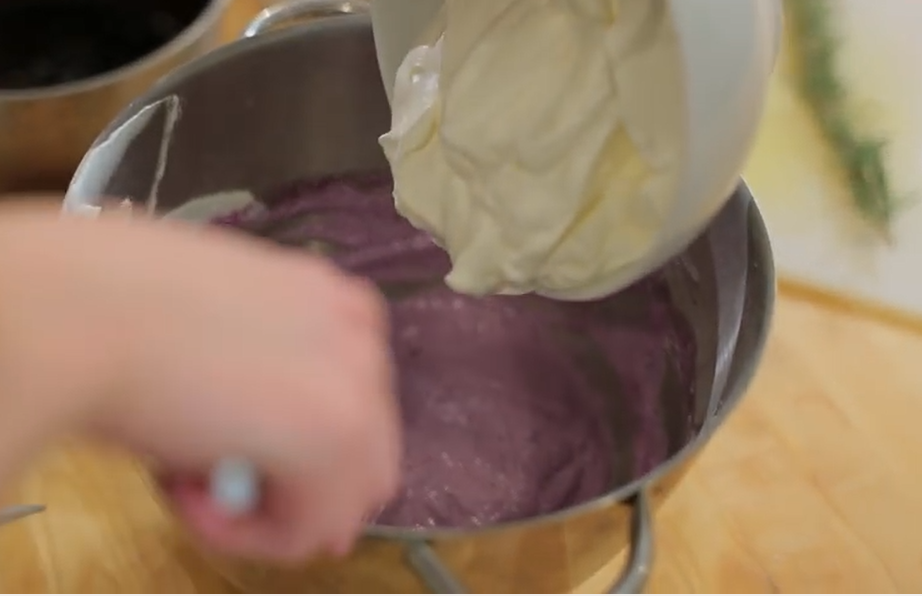 10. В красивый сиреневый черничный крем добавляем еще и взбитые сливки, хорошенько размешиваем.