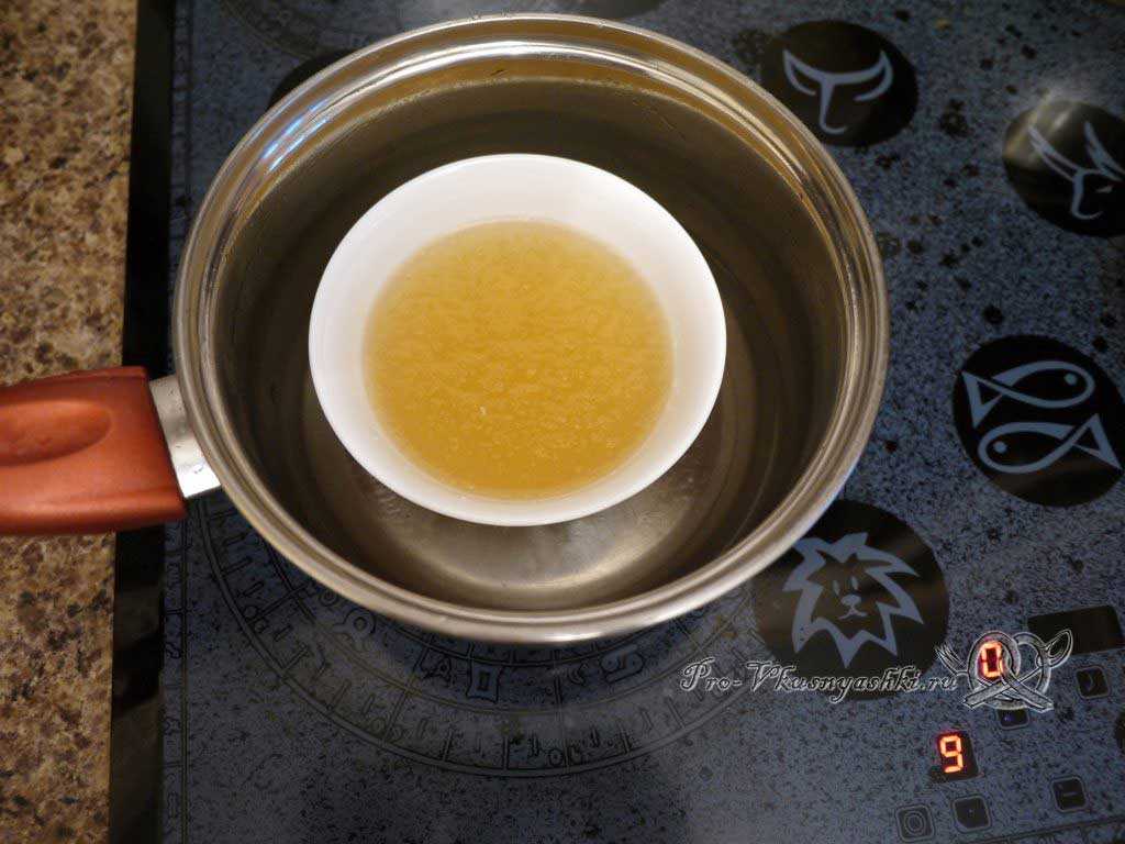Желатин набух, теперь его нужно распустить. Нагреваем ингредиент на водяной бане до теплого (не выше 40 С) жидкого состояния.