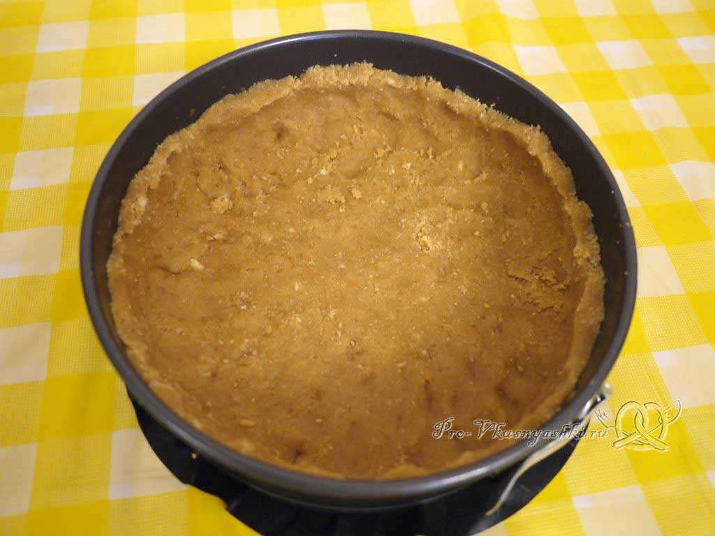 Распределяем на дне формы печенье с маслом, плотно утрамбовываем и помещаем в холодильник.