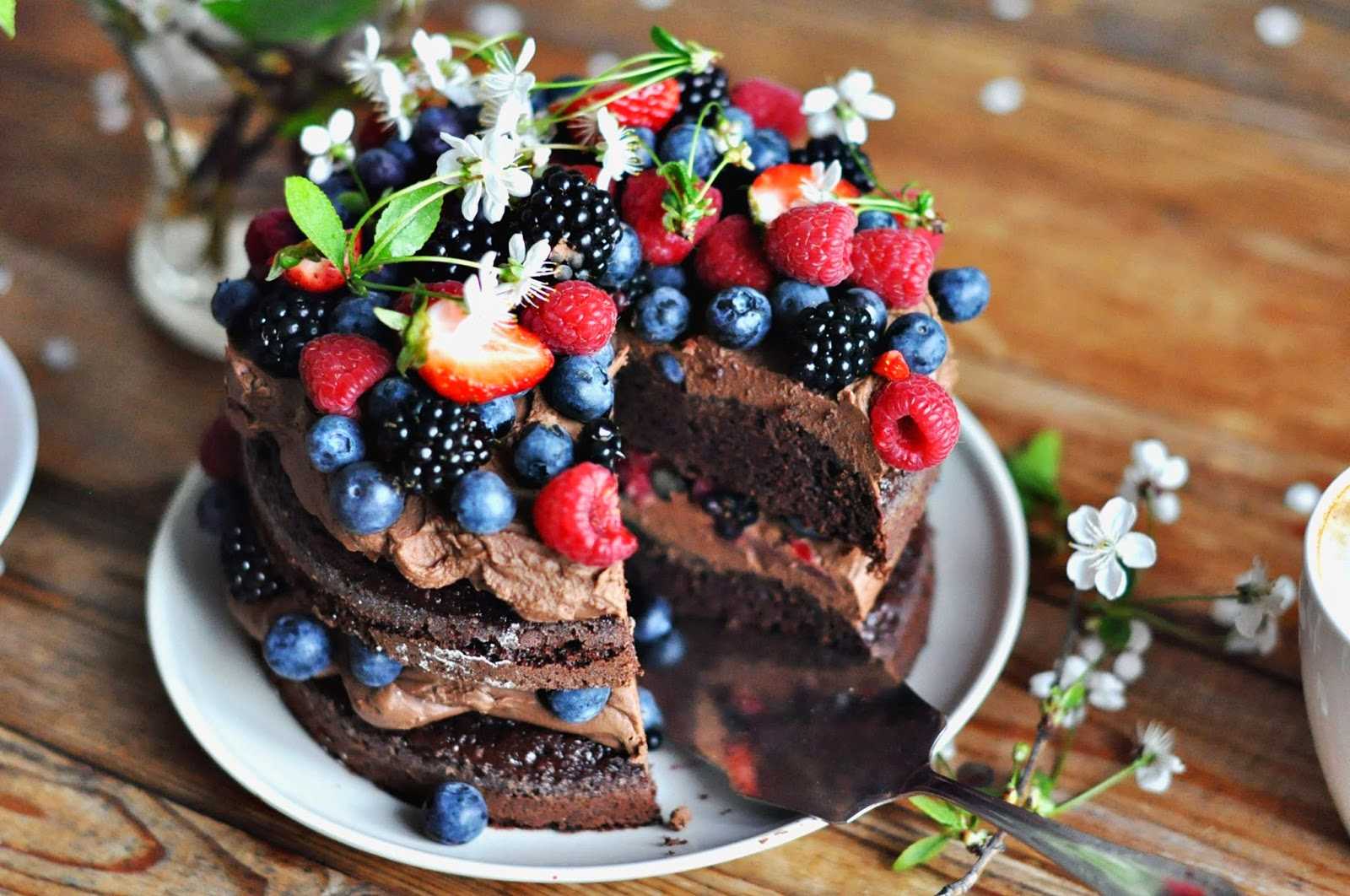 Когда корж испекся, проверьте готовность при помощи ножа или деревянной шпажки. После всех процедур поставьте его остывать. Когда выпечка остыла, вынимаете ее из формы, убираете со дна выпечки пергаментную бумагу, разрезаете ее на три равные части и приступайте к формированию шоколадного торта. Не забудьте добавить орехи, ягоды, даже некоторые из фруктов будут прекрасно с ним гармонировать.