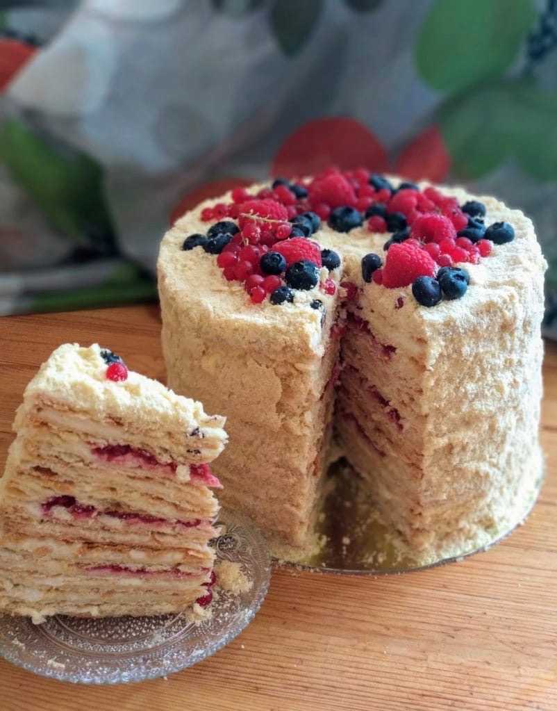 Для оригинального торта готовый крем можно разделить пополам и добавить в одну часть ложку ягодного сиропа. Куски десерта с коржами, промазанными разноцветными слоями крема, будут красиво смотреться на тарелке.