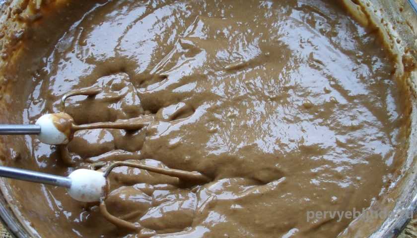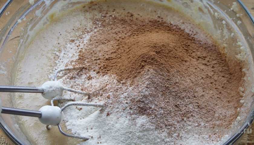 - Ко взбитой массе следует добавить молоко и постепенно ввести смесь из двух видов муки.
