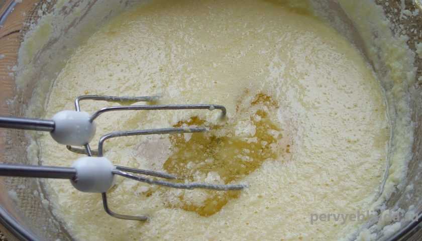 - Когда масса начнет увеличиваться в размерах, следует добавить к ней рикотту и повторно взбить миксером на низких оборотах, а затем добавить корицу и щепотку ванилина.