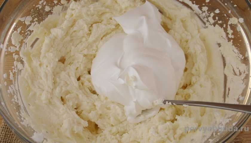 - Белки с добавлением щепотки соли нужно взбить до крепких пиков, а затем добавить их к тесту.