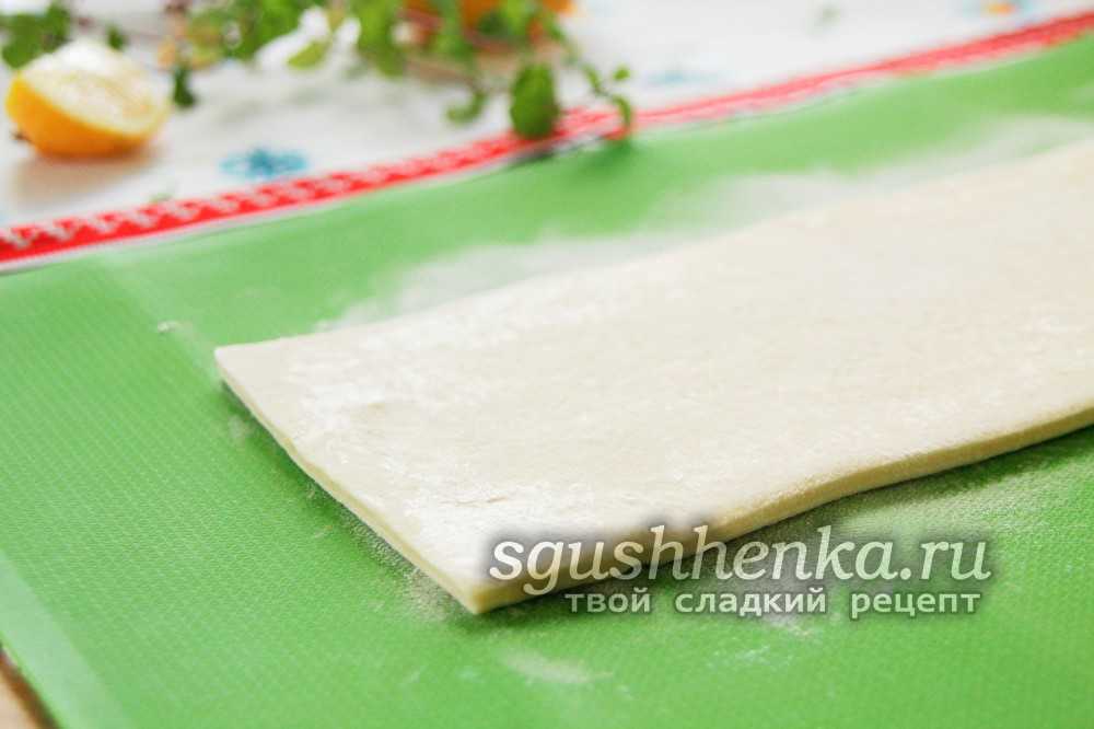 Рабочую поверхность (стол, доску), присыпать мукой. Размороженный лист раскатать, получив на выходе пласт в 3 мм толщиной. Разрезать на две-три части вдоль, затем поперек – на прямоугольники.
