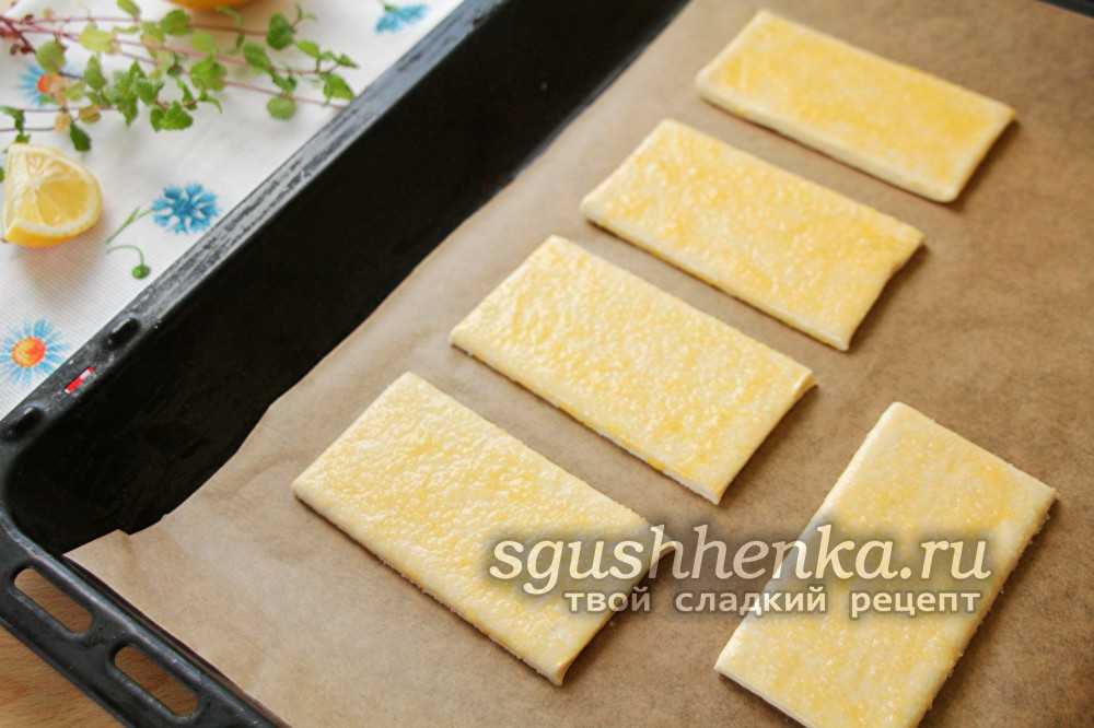 - Вам заранее стоит подготовить поверхность, на которой вы будете запекать слоечки, например, положить на поверхность противня пергамент, и уже поверх него выложить получившиеся рулетики.