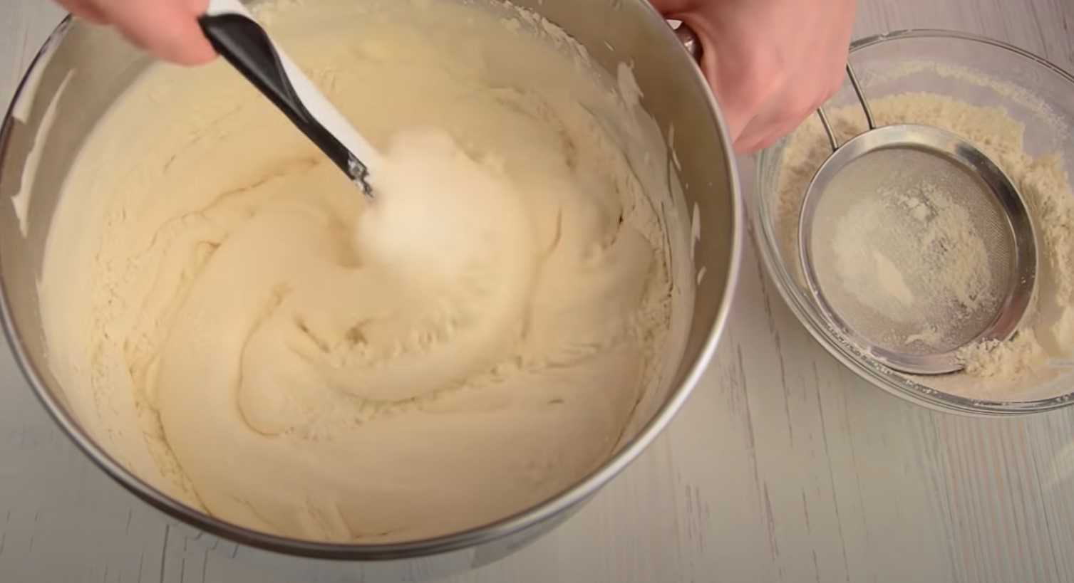 - Масло взбиваем с сахаром и ванилином. Начинаем делать тесто. Смешиваем просеянную муку, разрыхлитель и щепотку соли.