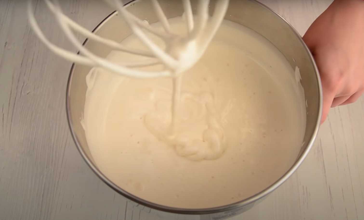 Снимаем емкость с водяной бани и взбиваем массу с помощью миксера на высоких оборотах. Смесь должна увеличиться в объеме, побелеть, приобрести консистенцию сметаны.
