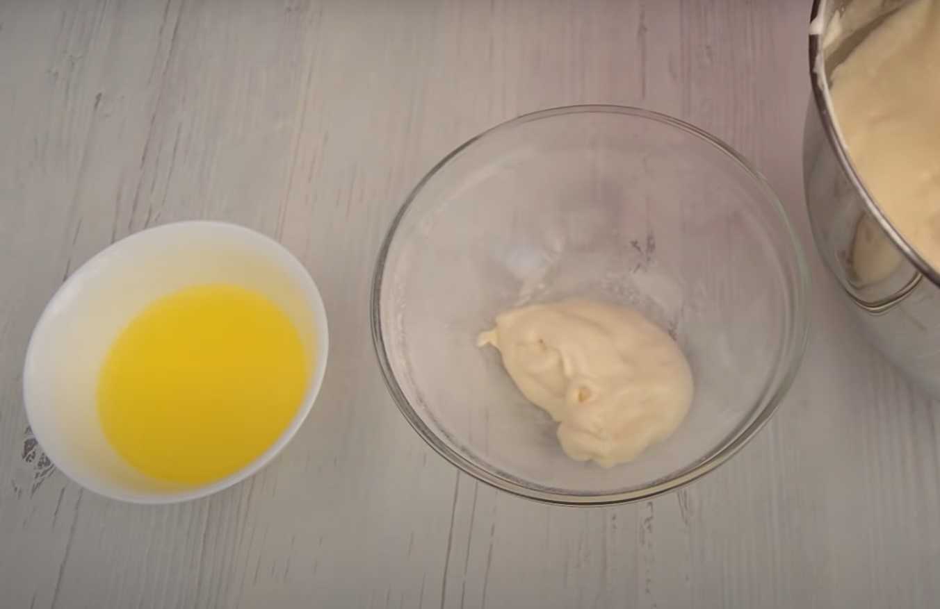 Добавляем сливочное масло к 2-3 столовым ложкам теста, перемешиваем до однородности. Возвращаем сливочную массу в основную емкость.