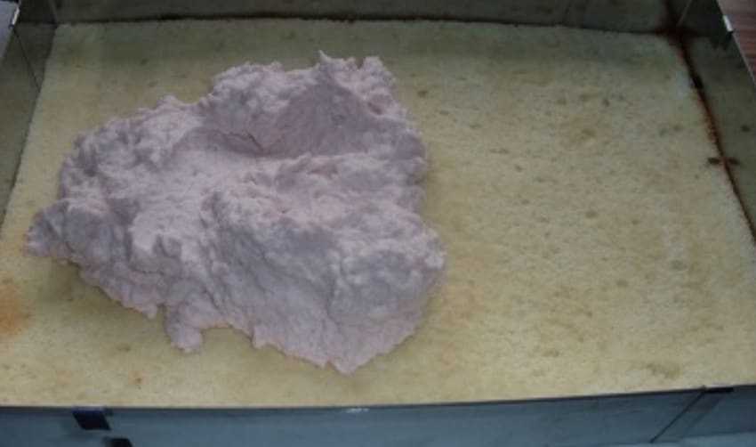 - Приступаем к сборке рулета. Наносим на меренгу ровным слоем крем.