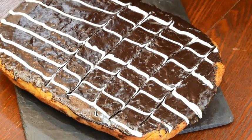 Пирог выпекается при температуре 150-200 градусов 30-40 минут. А если тесто разделить пополам и в одной части добавить какао, корж будет двухцветным. Для этого тесто следует переливать ложкой в форму, чередуя цвета, и каждый раз переливать в середину круга.