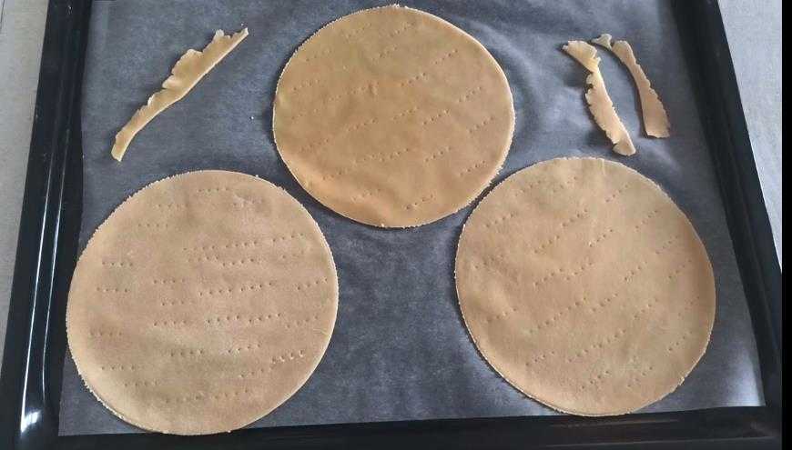 После выпекания при необходимости подровнять круги под нужный размер торта, охладить. Обрезки еще немного подсушить на сковороде, а затем перемолоть в крошку для обсыпки.