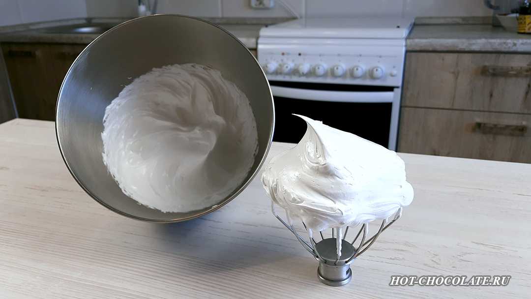 - Белки взбиваем миксером сначала на средней скорости до мягких пиков, затем тонкой струйкой всыпаем сахар и взбиваем до жестких пиков уже на высокой скорости.