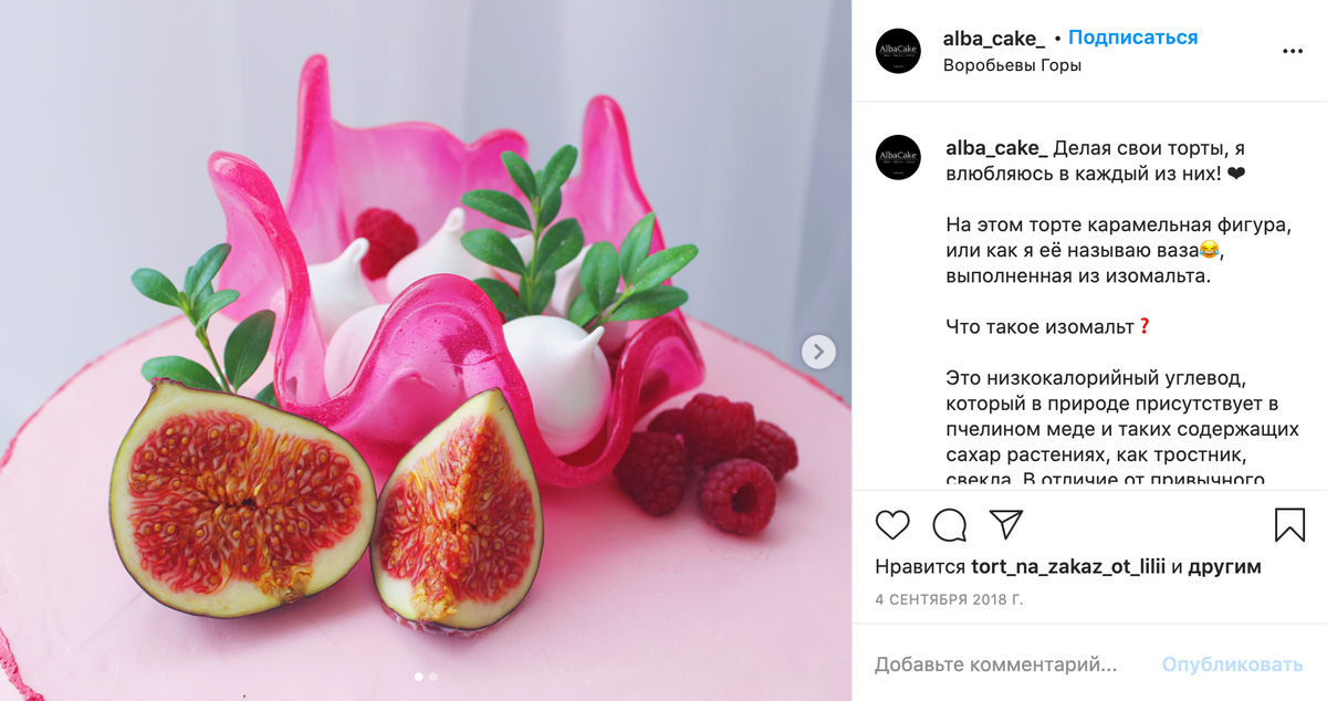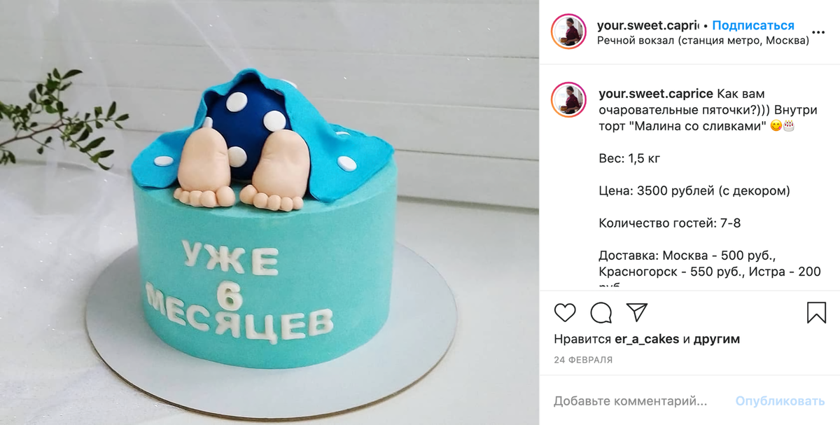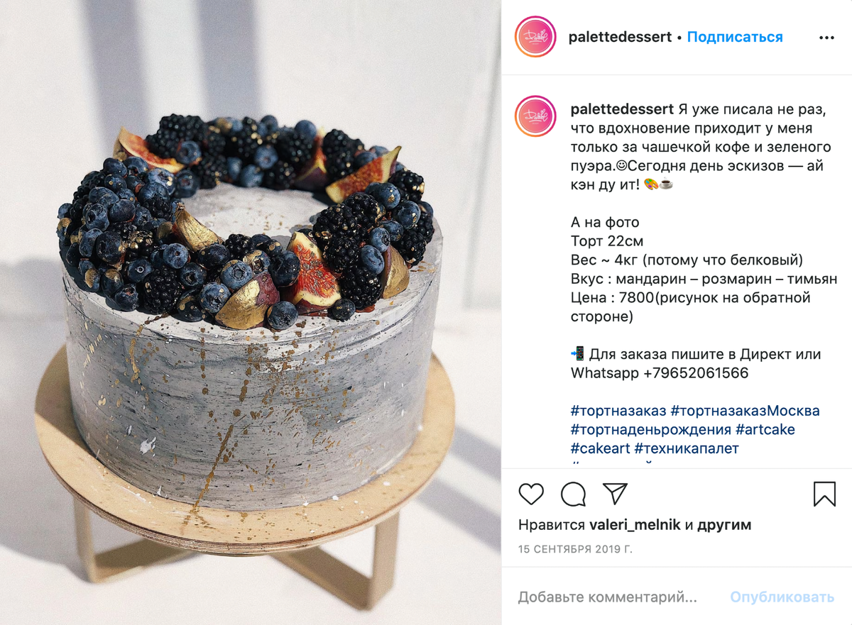 Почти все кондитеры из «Инстаграма» указывают цену за 1 кг торта, но меньше 1,5—2 кг не пекут, потому что это невыгодно. То есть при стоимости 1600 Р за 1 кг заплатить надо будет минимум 2400 Р. Это не всегда удобно. Если на празднике мало людей, 1,5 кг торта за раз не съесть — остатки придется доедать неделю.